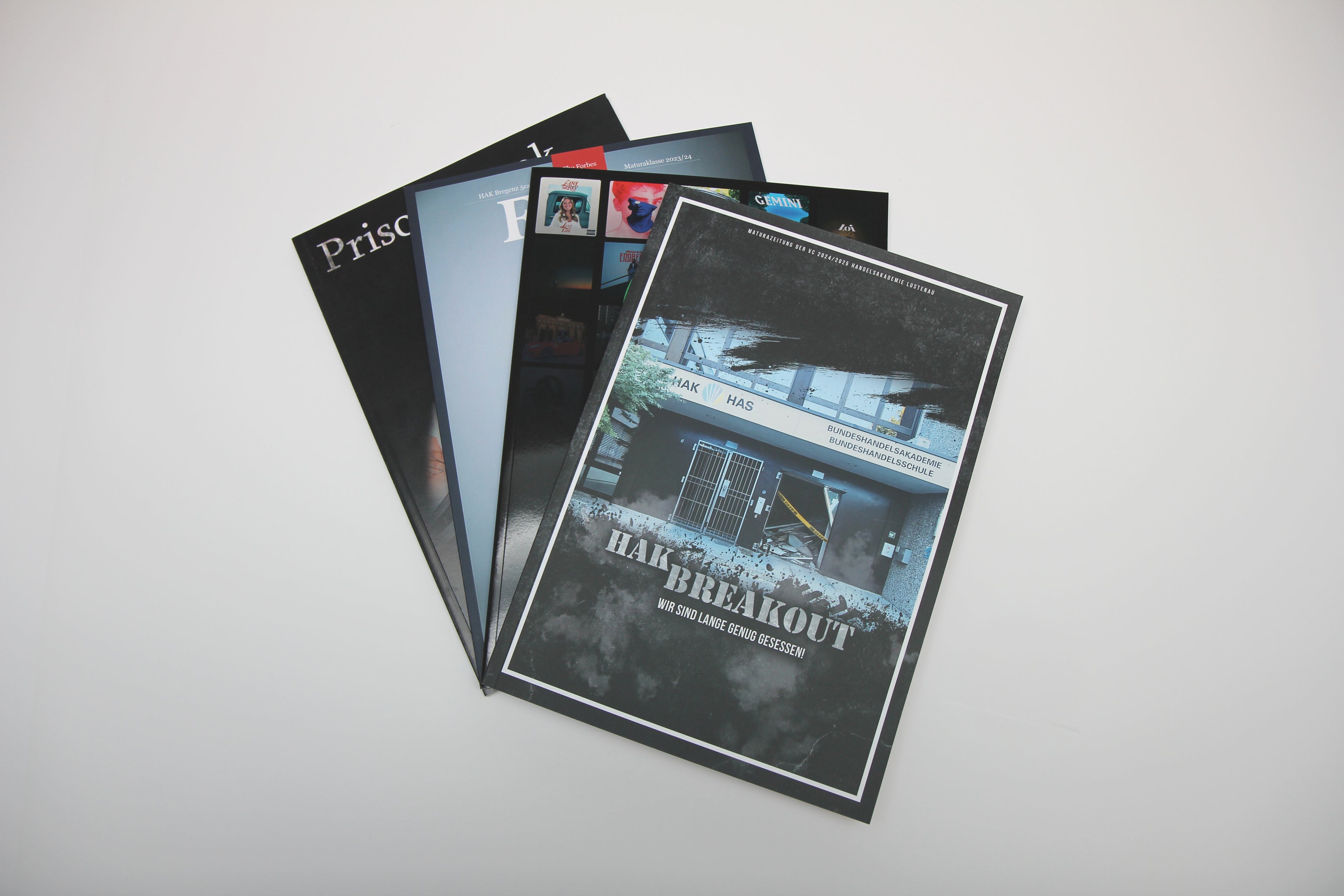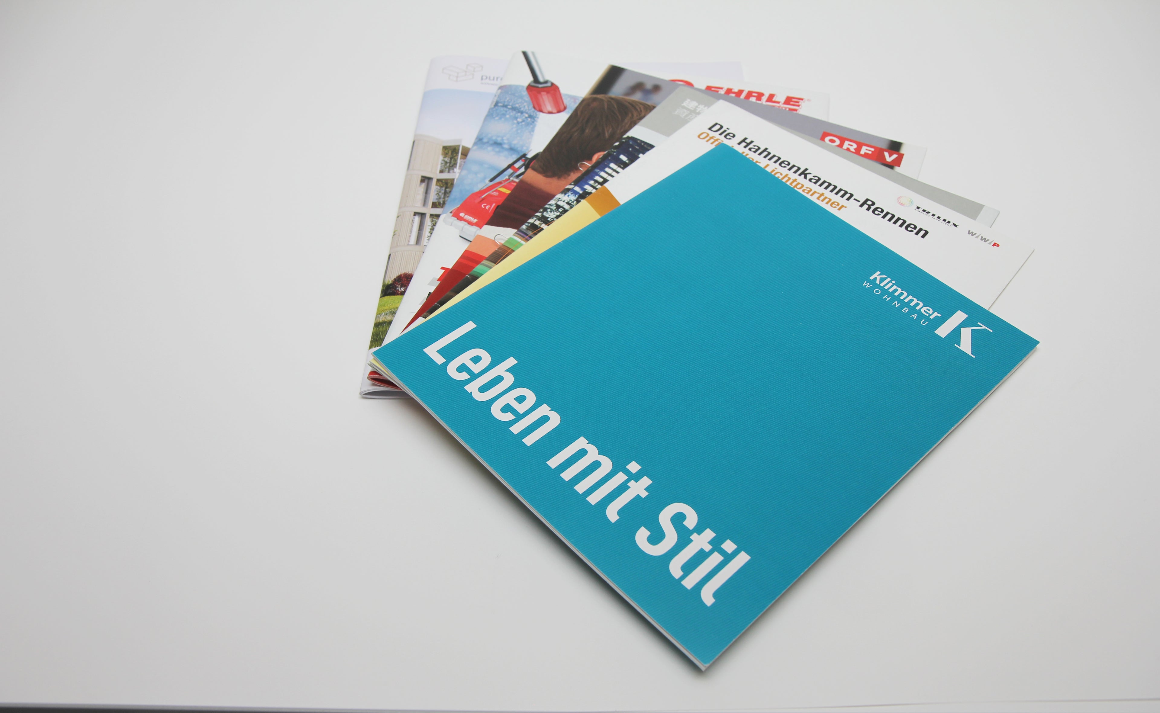 Broschüren in 3 Papierqualitäten, Formate A4 oder A5.